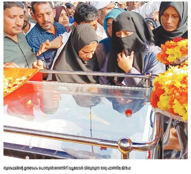 ദു:ഖഭാരം തളംകെട്ടിനിന്ന കുനിയില് കൊടവങ്ങാട്ടെ മൈതാനിയില് ദേശീയ പതാക പുതച്ചുകിടന്ന പ്രിയതമനെ അവസാനമായി ഒരു നോക്കു കാണാന് നവവധു എത്തിയപ്പോള് തീരാനോവില് ആയിരങ്ങള് മൗനത്തിന്റെ ഗുഹയിലാണ്ടു. നുഫൈലിന്റെ നവവധു കൊടിയത്തൂര് കുളങ്ങര സ്വദേശി ഫാത്തിമ മിന്ഹ ചില്ലുകൂട്ടിലൂടെ പ്രിയപ്പെട്ടവനെ കണ്ടു. മരണ വാര്ത്തയറിഞ്ഞത് മുതല് മൂന്ന് നാള് അടക്കിപ്പിടിച്ച ഹൃദയവേദന തന്റെ പാതിയെ നേരില്ക്കണ്ടപ്പോള് കണ്ണീര്മഴയായി. ഒന്നിച്ചുള്ള ജീവിതത്തിന്റെ ഇരുപത്തിനാലാം നാളാണ് വിധി നുഫൈലിനെ തട്ടിയെടുത്തത്.